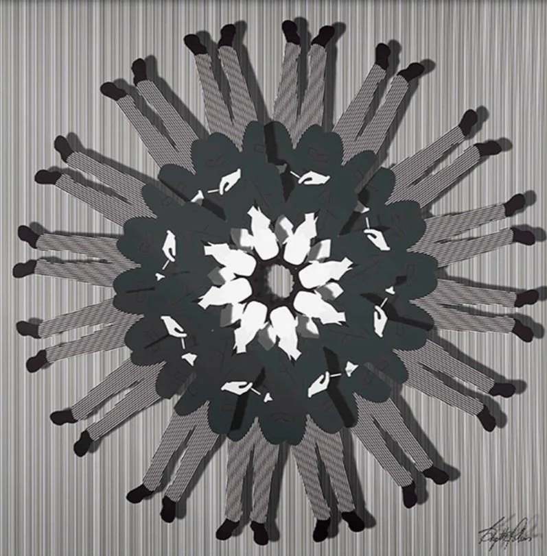 In my Platonic Solids series, the human form within the geometric art acts as a unit which then repeats on itself, while the solids maintain their integrity and follow the rules of nature. Each work, through its unique geometry, plays with varying levels of consciousness.